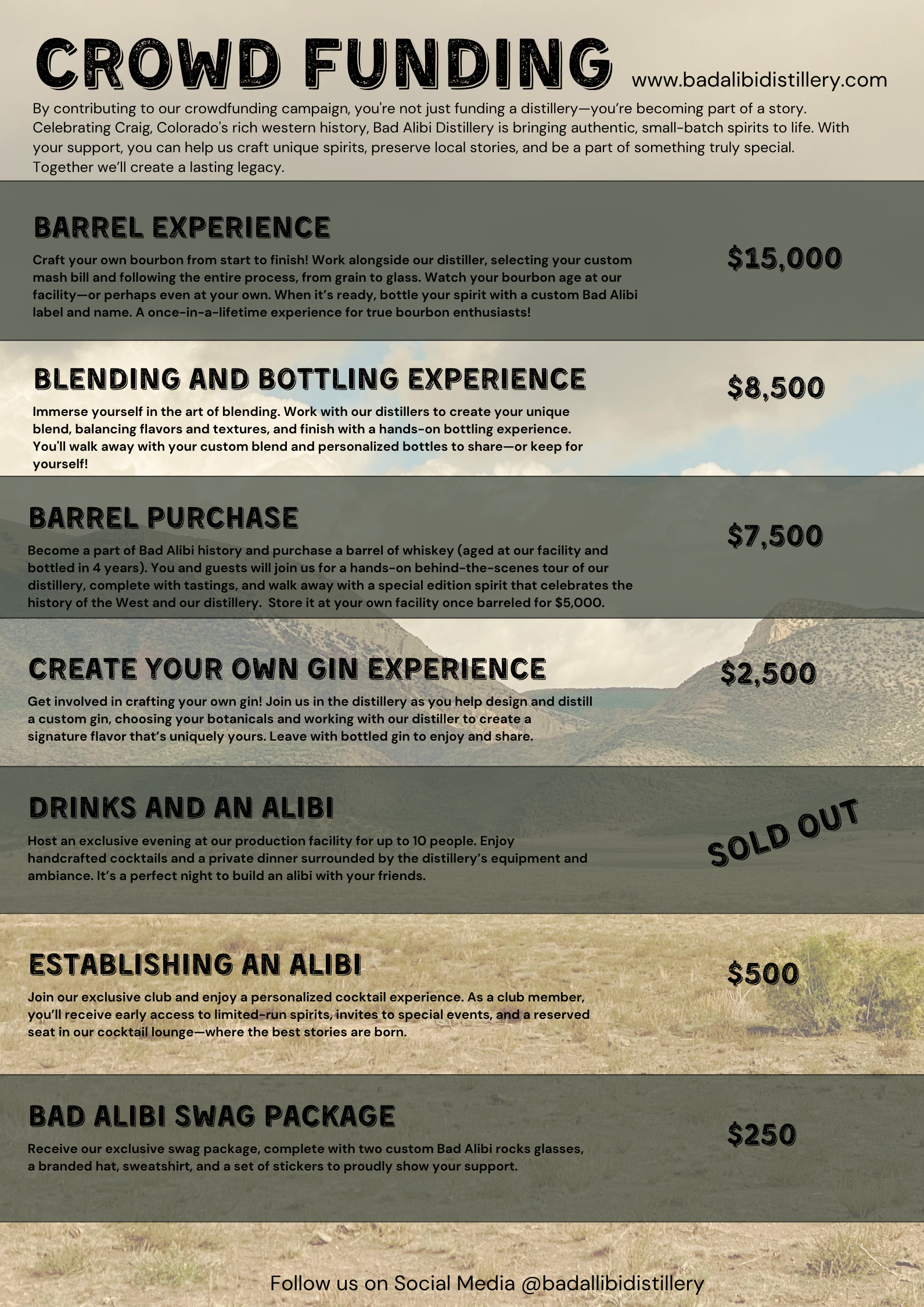 By contributing to our crowdfunding campaign, you're not just funding a distillery—you’re becoming part of a story. Celebrating Craig, Colorado's rich western history, Bad Alibi Distillery is bringing authentic, small-batch spirits to life. With your support, you can help us craft unique spirits, preserve local stories, and be a part of something truly special. Together we’ll create a lasting legacy.